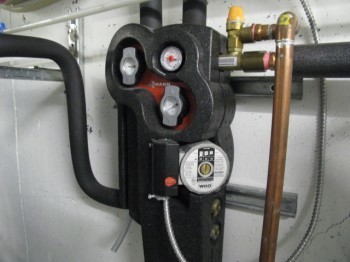 The GSHP system is comprised of five 5.4 t (6 tons) systems drawing from fifteen 85 m (280′) wells. These are vertical wells (more efficient than horizontal wells) and surrounded by hard or crushed rock (again, this is more efficient than sand or soil for heat exchange), making this system very effective and efficient. Combined with the SHW system, which adds extra heat storage capabilities to the system, and an efficient building envelope, the owner estimates that the system achieves a coefficient of performance (COP) of 6 to 8, where most GSHP achieve an estimated COP of 4. The system seems to work best during the shoulder seasons (spring and fall). During the time of visit, in July, the system was trapping heat in the ground above 80 °C (176 °F) for use in the winter.