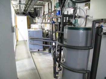 This apartment owner has decided that ground source heat pumps (GSHP) are an excellent investment, and the right environmental choice for lowering emissions. Since GSHPs work best in larger structures, such as this 26-unit, 2044 m2 (22000 sq. ft.) apartment complex, this building is ideally suited for such a system. Also, combined with the fact that this GSHP also integrates solar hot water (SHW), the system is very cost effective as a result, and easily meets all of the building’s heating and cooling needs throughout the year.
