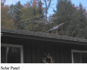This off-grid cabin has two 15-W PV panels from Canadian Tire, charging two 12-V car batteries. This system was installed to replace a small diesel generator. The owners realized that going with solar had many advantages over the previous set up, including lower maintenance, lower fuel costs, and being affordable to start with.