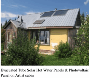 This is an off-grid system that more than meets the needs of this family, home-based business and supplies surplus power to a small artist cabin nearby. The house is a timberframe with strawbale infill, 3 storey, 195 m2 (2100 sq. ft.) building. The cabin is a load-bearing strawbale contruction, 1.5 storey and 60 m2 (650 sq. ft.).