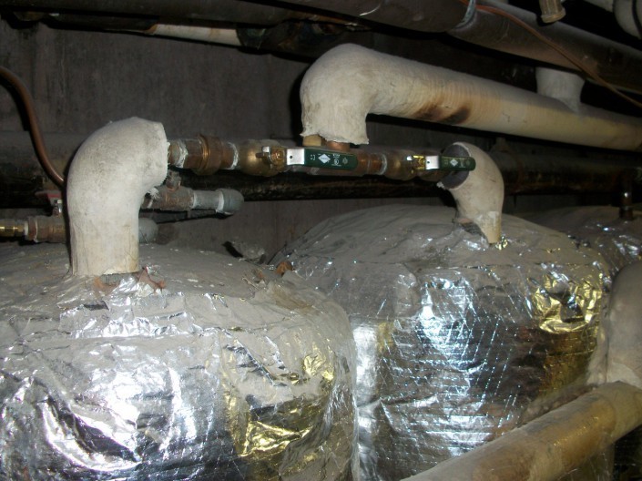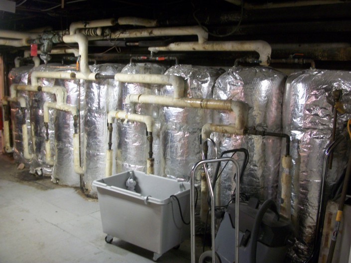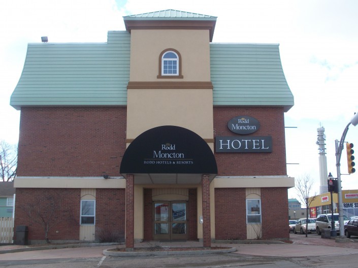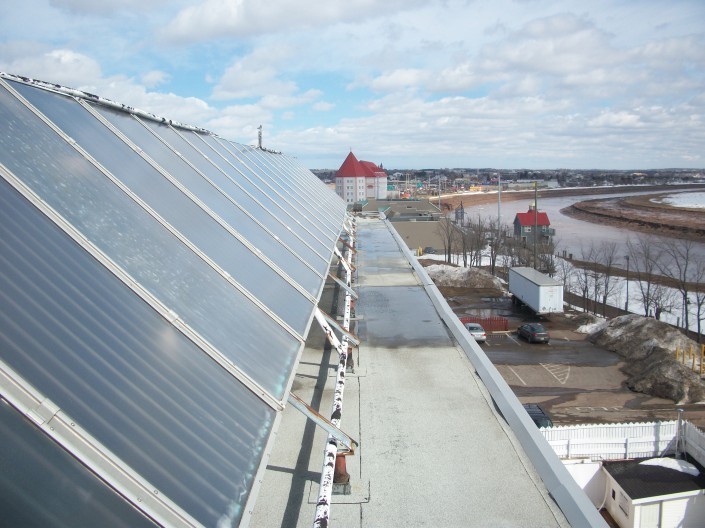 This large solar hot water collector system is mounted on the Rodd Moncton Hotel roof. Oriented perfectly toward the southern sky, it is an enormous array. However, very little information about the manufacturer and initial installation are available, because it was installed in 1975, when the hotel was built, making it one of the oldest solar hot water installations in the province. The manager has observed that the pipes coming from the collectors were at one time hotter than they currently are. The collectors appear to be worn with some leakages around the panels and the pipes. Hot water collected from the 2-dozen or so collectors on the roof is pumped to eight hot water tanks. The hotel pool draws on that stored energy during the summer months to raise pool temperatures to a comfortable level. The system is drained each year before winter to prevent freezing. Although they may be in need of a refurbishment, the fact that the collectors still function after 35 years of service is a testament to their durability and cost-effectiveness.