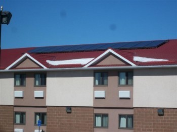 This environmentally friendly 4 Green Key Eco Rated hotel is reducing the carbon footprint of its 104 rooms by providing solar heated hot water. Hotel occupants enjoy the benefits of using renewable energy from the sun whenever they use hot water. Solar energy is absorbed by twelve flat plate solar hot water collectors (SHW), which are bolted onto the roof. The SHW collectors are located on the south-western facing side, which is the sunniest. During the interview, at 3:00 pm in mid-March, on a clear sunny day, the temperature outside was -4.5° C (23 F). It was cold outside, but the collectors were absorbing sunlight, and had already raised the temperature of the heat transfer fluid to 73 ° C (163 F).
