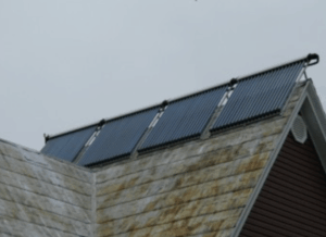 This evacuated tube solar hot water system with 65 gallon tank provides space heating through wall mounted radiator.